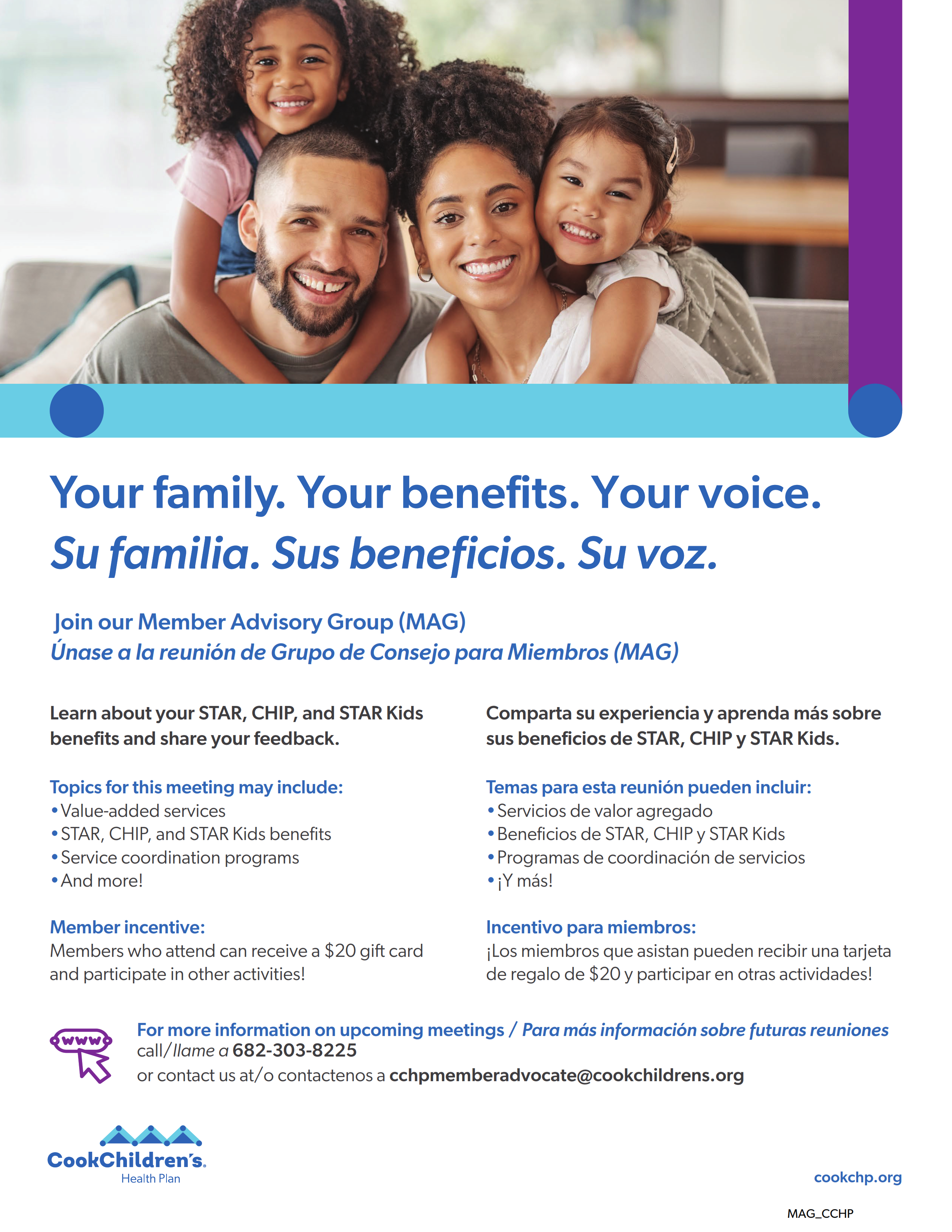 Cook Children's Health Plan has been serving the Tarrant Service Area Medicaid and CHIP families since 2000, which includes Members across Wise, Denton, Parker, Tarrant, Hood and Johnson counties. We ensure Members receive the physical and behavioral health, pharmacy and social support services you need, when and where you need them.