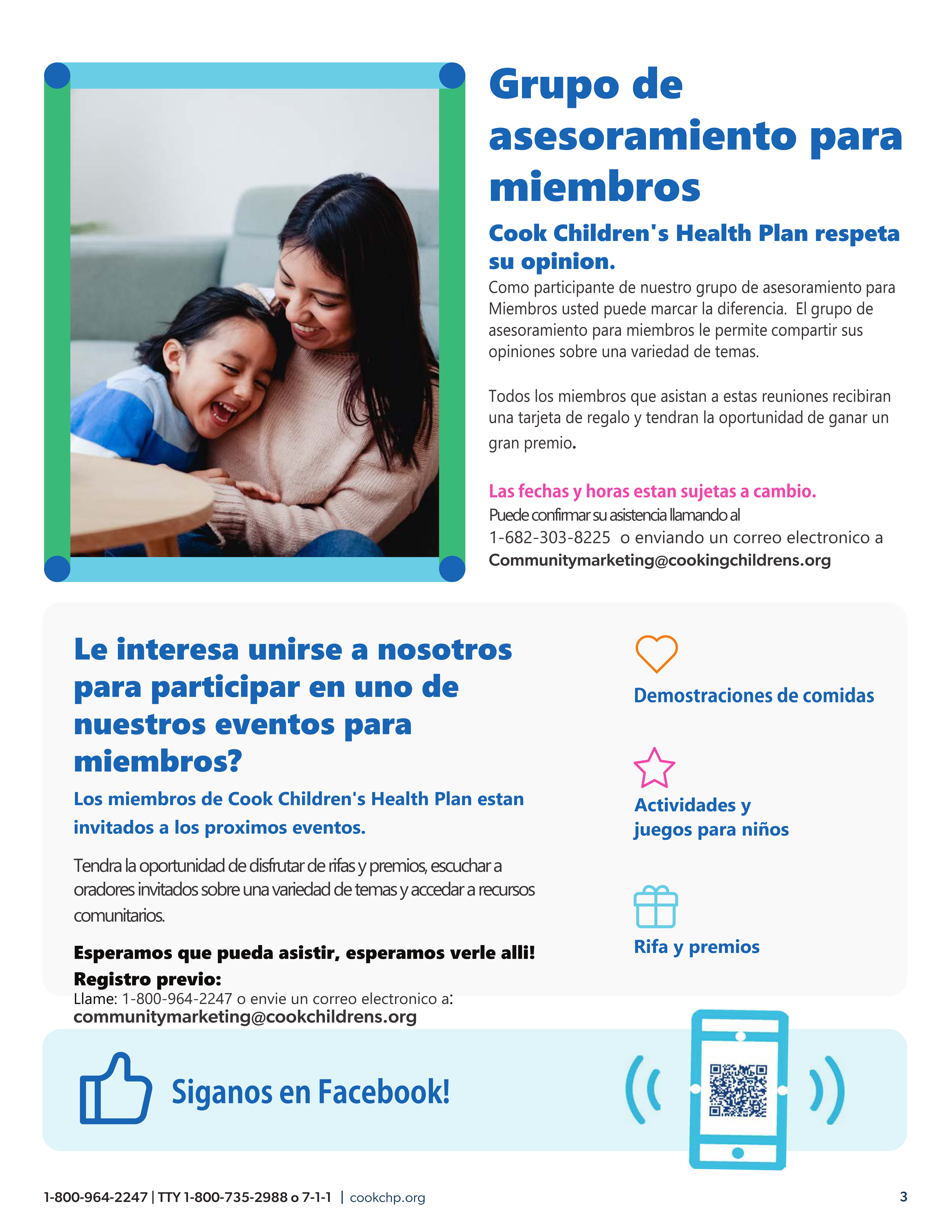 Si usted o un miembro de su familia necesita renovar sus beneficios de Medicaid/CHIP, llame al 211 para obtener un paquete de renovación o puede llamar a servicios para miembros al: 1-800-964-2247 o a nuestra línea local al 1-682-885-2247 para obtener ayuda de uno de nuestros representantes de servicios para miembros. Gracias por ser miembro de Cook Children's Health Plan.